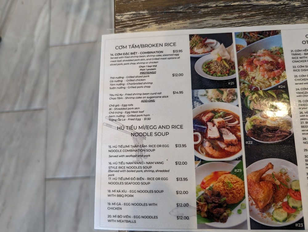 Choice A ($.): Thit nuong - Grilled sliced pork Suon nuong - Grilled pork chop Ga nuong - Grilled chicken Tom nuong - Charbroiled shrimp Nem nuong - Grilled pork ham Cha gio - Egg rolls Bi - Shredded pork skin Cha trung - Steamed egg meat loaf Choice B ($.): Tau Hu Ky - Fried shrimp bean curd roll Chao Tom - Shrimp cake in sugarcane stick